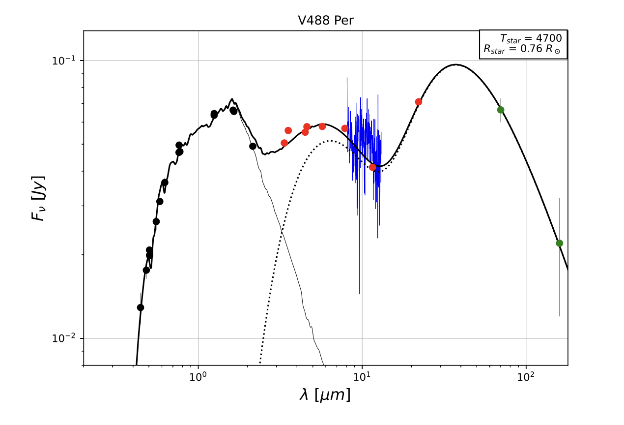 I revisit V488 Per—the dustiest known main sequence star—and find no mid-infrared emission features and no evidence for stellar or sub-stellar companions, suggesting an unusual dust composition and system architecture.